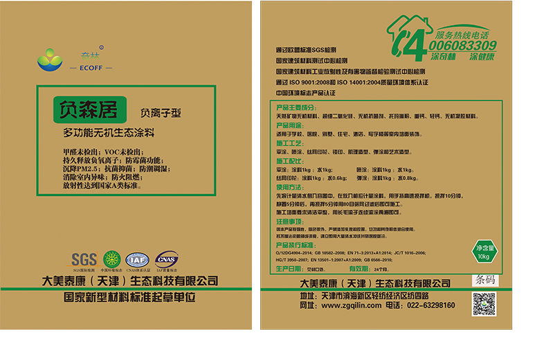負森居-負離子型:無機多功能生態涂料1.甲醛未檢出;VOC未檢出;2.抗菌抑菌;防霉菌功能;3.防潮調濕;消除室內異味;4.防火阻燃;5.放射性達到國家A類標準;6.持久釋放負氧離子;沉降PM2.5。凈含量:10kg